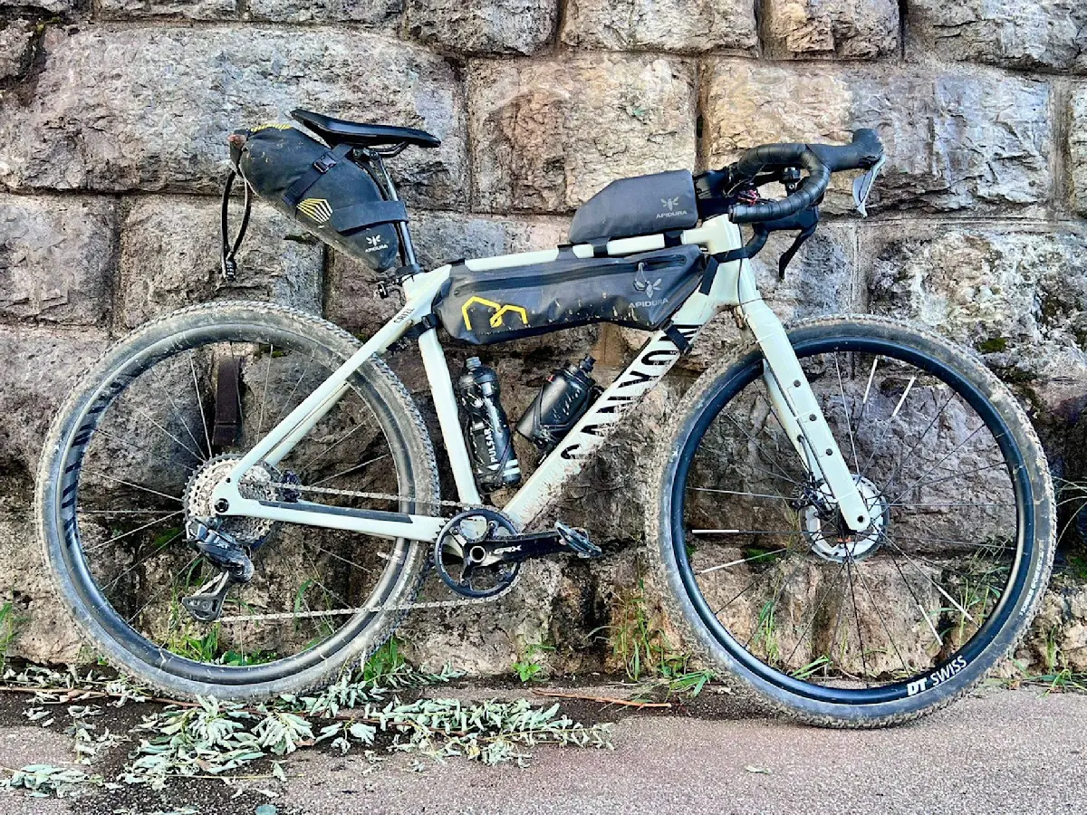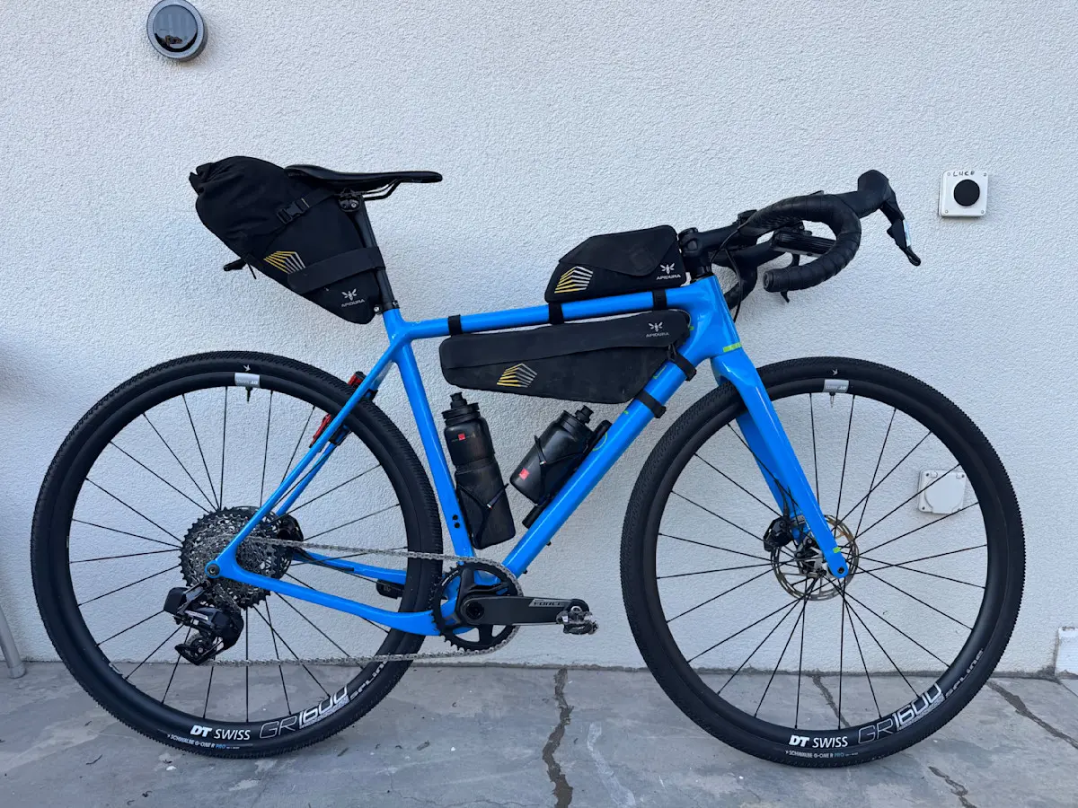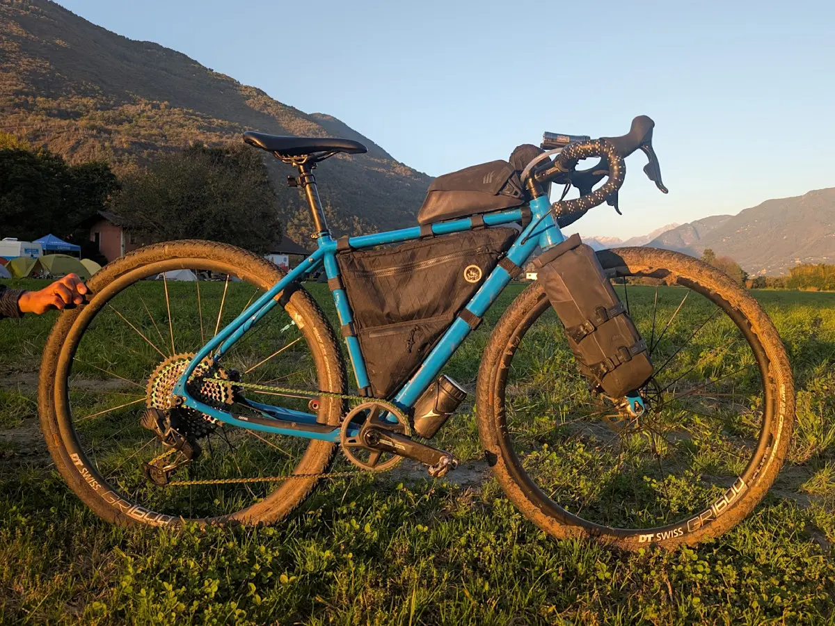 Key items of kit: Homemade framebag Salsa handlebar setup Onxy hub Sram Apex Axs - Eagle GX mullet 38 - 10/50 gear ratio Acros Wheels Bivo bottles