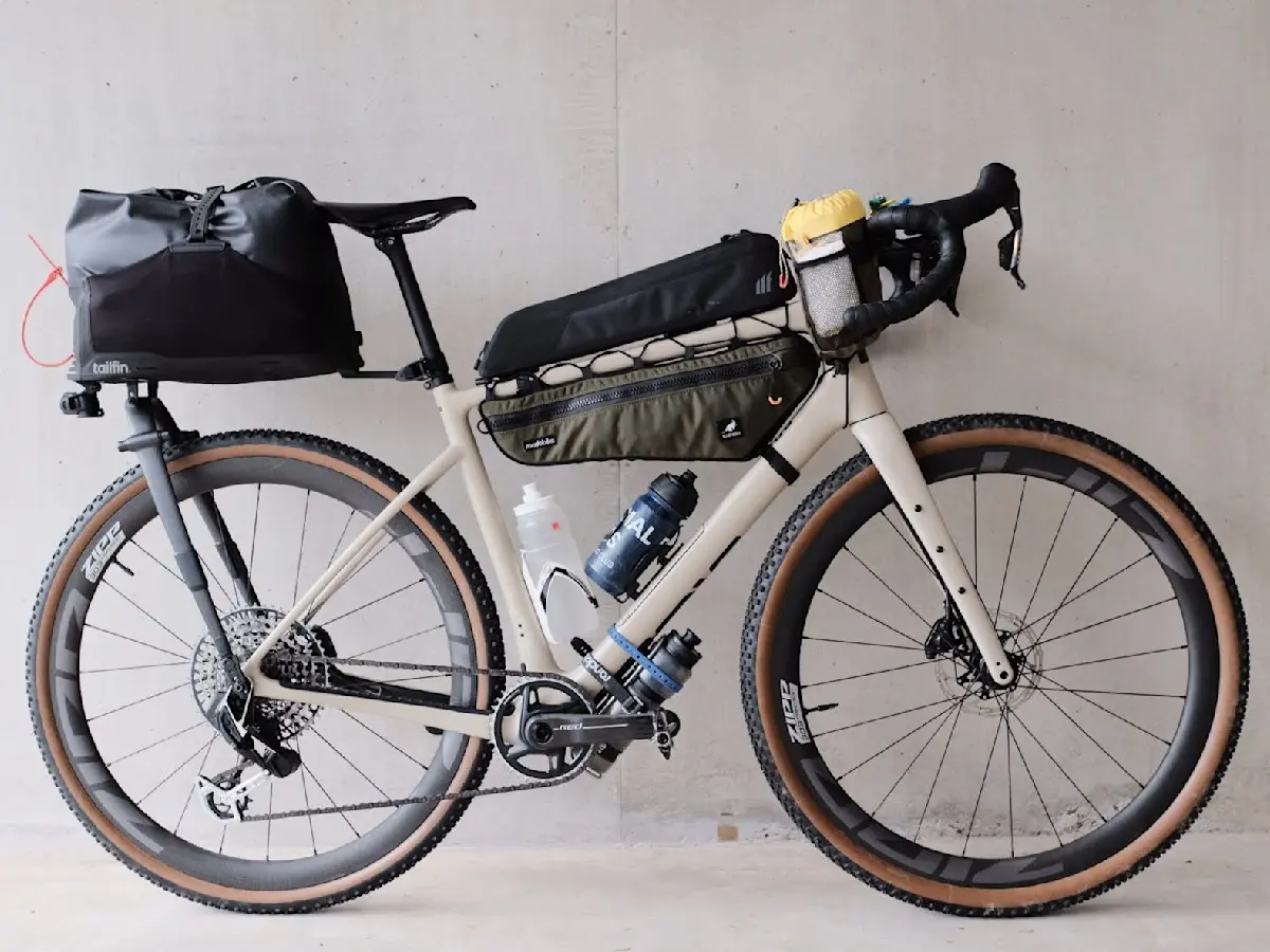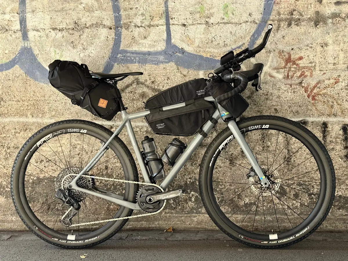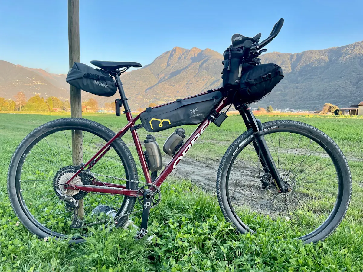 Key items of kit: Homemade framebag Salsa handlebar setup Onxy hub Sram Apex Axs - Eagle GX mullet 38 - 10/50 gear ratio Acros Wheels Bivo bottles