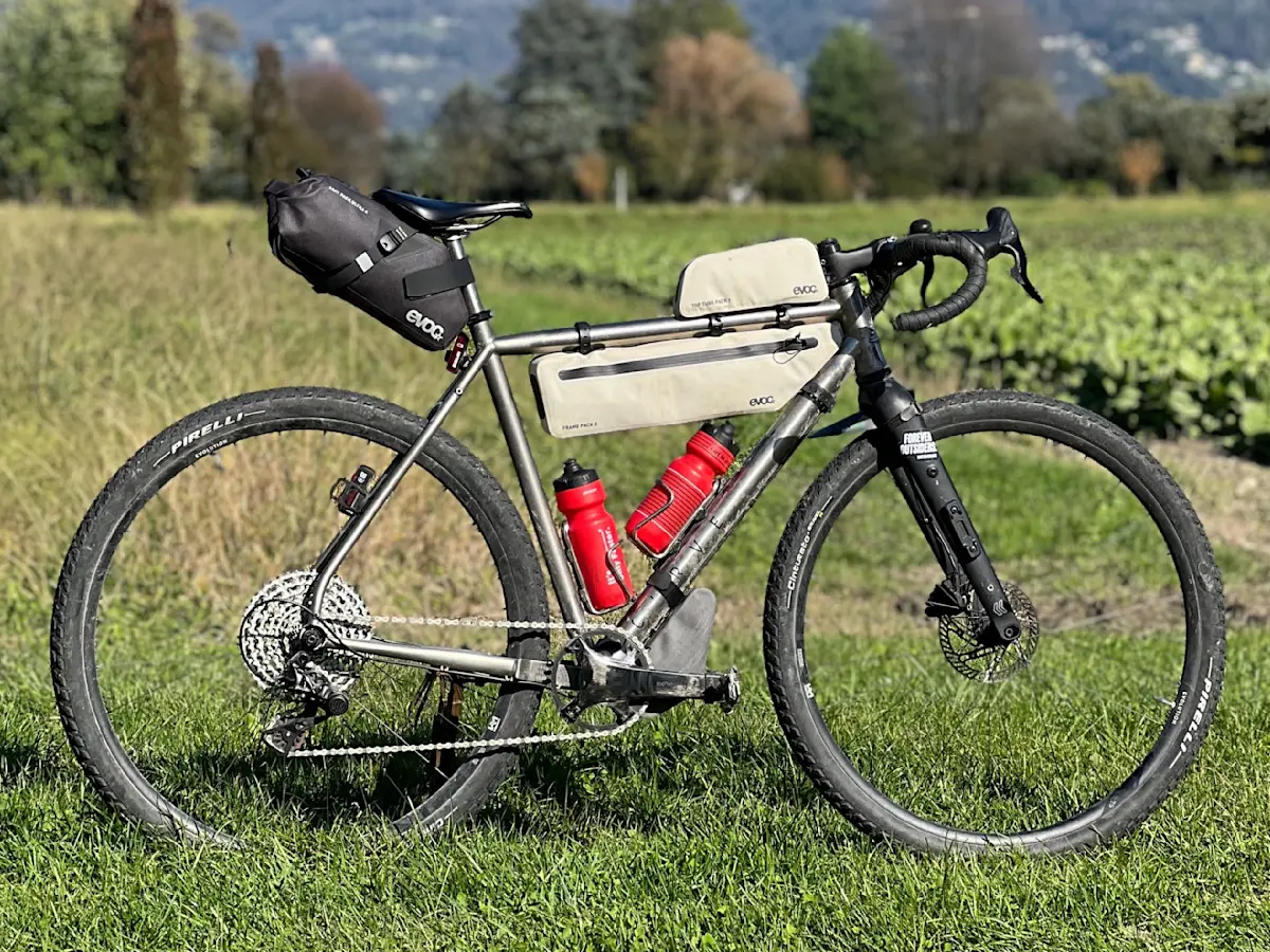 Key items of kit: All bags EVOC Prototypes. SEATPACK ULTRA 4 TOP TUBE PACK 1 FRAME PACK3 MULTI FRAME PACK 0,7 GPS Coros Tires Pirelli Cinturato M Shifting/Brakes Campagnolo Ekar