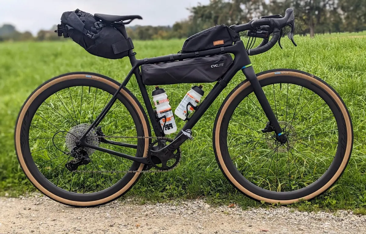 Bike: Open Upper self-built, Campagnolo Ekar 1x13 groupset, Aerycs GCX Terra 40 wheelset with René Herse Bon Jon Pass 35mm Schwalbe Aerotthan tubes, Restrap top tube bag, Cyclite Framebag XT, Topeak Backloader saddle bag, Lupine Rotlicht rearlight and 2x Trek Ion pro rt frontlight
