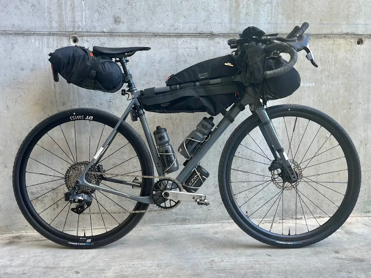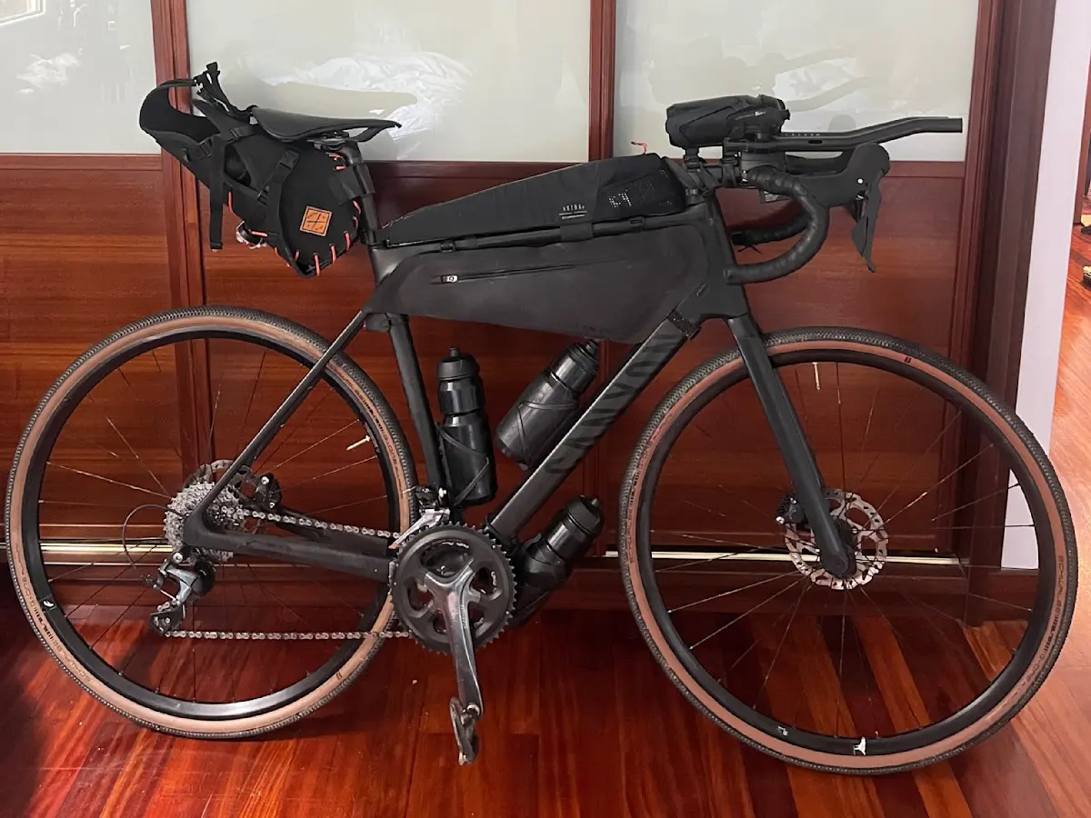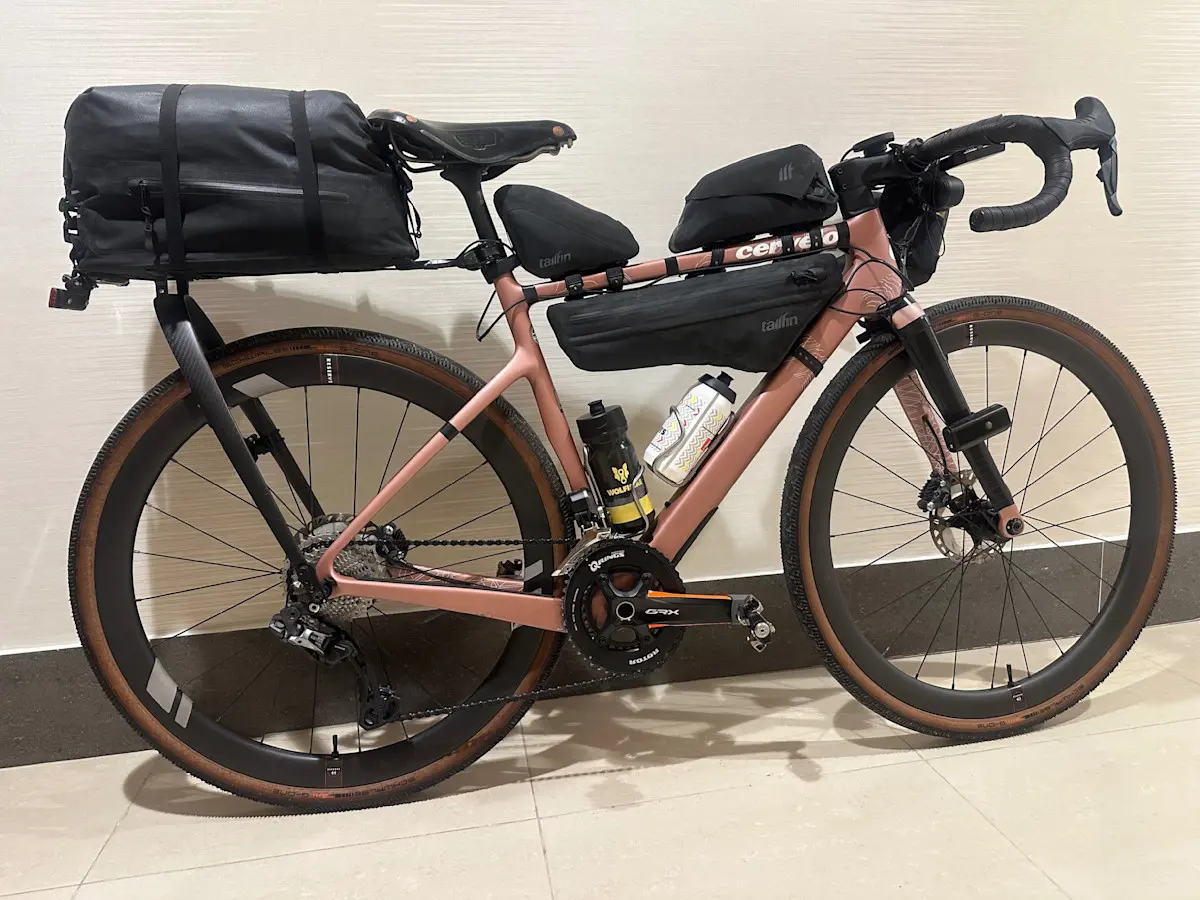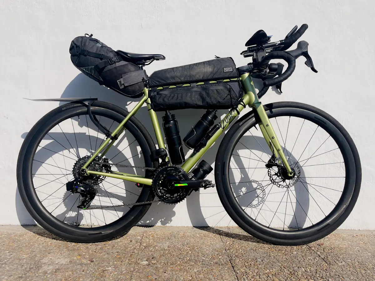Key items of kit: GRX Di2 2x groupset. Redshift aerobars and dual position seatpost. Apidura bags. Alpkit sleeping bag and bivi