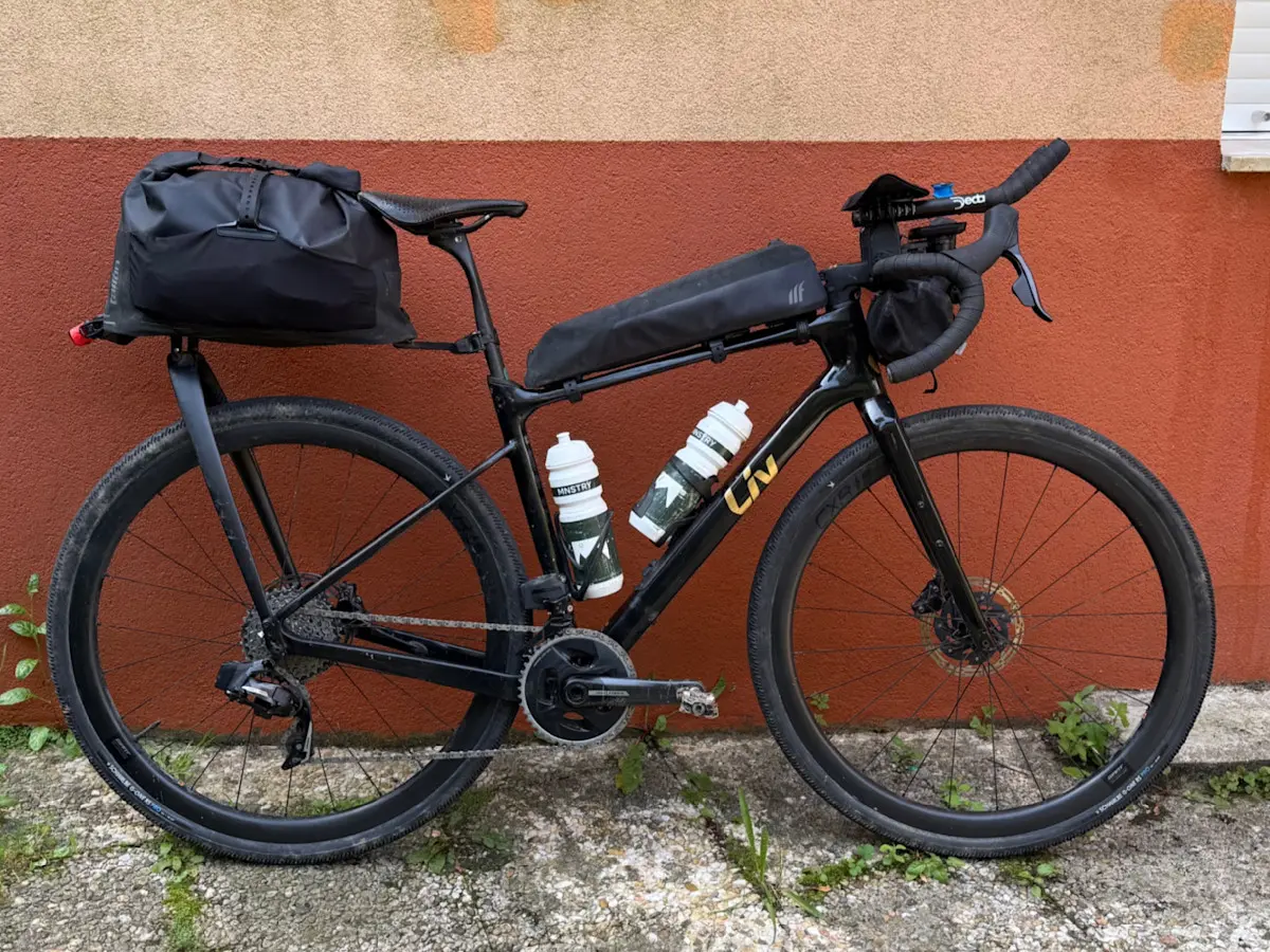 Key items of kit: The bike is equipped with a mix and match saddle bag from Restrap and Décathlon. The frame bag is a Restrap and my candy handlebar bag is Zefal. I will travel with a trail running bag (Décathlon) to easily access my warm and rain cloths.