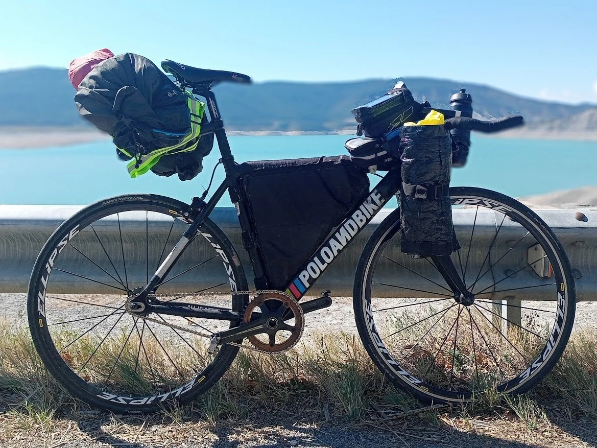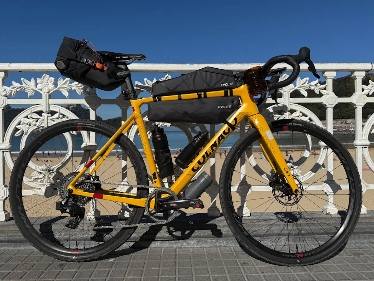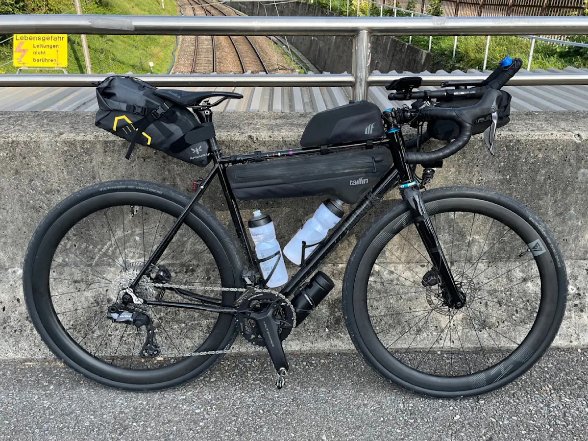 Bike: Giant Revolt Advanced 1 with stock handlebars and seat, everything else has been customized. Eagle Axs 10-52 with Ratio 34t chainring - perfect gear range for me to not blow my legs out on massive climbs. Redshift seatpost and stem suspension system provides much needed comfort on rough roads and rocky gravel. Rolling on surprisingly fast Tufo Gravel Thundero 40 tires for their excellent wet performance to give me confidence on misty pyrenees peaks. Running Tailfin aeropack with full sleep kit for proper recovery: Cumulus xlite 200 sleeping bag, Thermarest pad, MLD eVent Soul Bivy. In the cockpit, I’ve got Profile Design aerobars holding up a Cyclite aerobar pack straddled by 2 Cyclite food bags loaded with nuts, gels and other dense calories. Finally: Apidura frame bag and Tailfin front/rear/downtube bag for warm clothes, electronics, hygiene and tools. Water storage: 2 650ml bottles and an apidura hydration vest. Lights: dynamo powered front/rear by Supernova and Garmin Varia for oncoming car alerts.