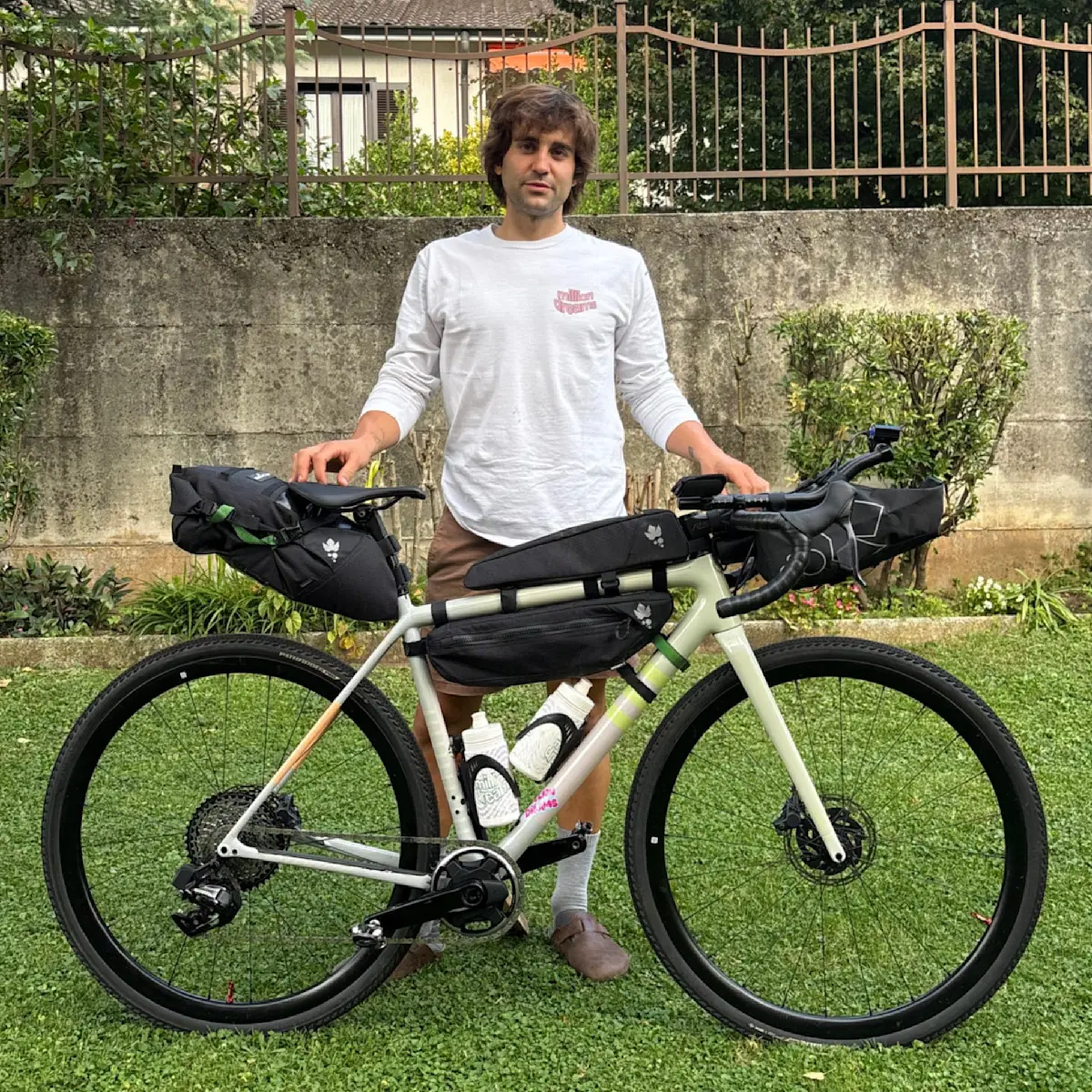 Bike: I’m riding my custom Quokka Cycles bicycle, handmade in France. It’s a steel all-road bike equipped with a SRAM Force groupset 12 speeds (10/36 cassette, 46/33 chainrings) and Princeton carbon wheels with Specialized Mondo 35” tires. I have a SON dynamo hub up front, with a set of Supernova lights. I also use Deda Elementi aerobars and an Ass Savers Win Wing. All the bags are from Tangente Atelier, also handmade in France.