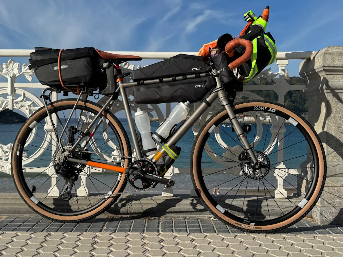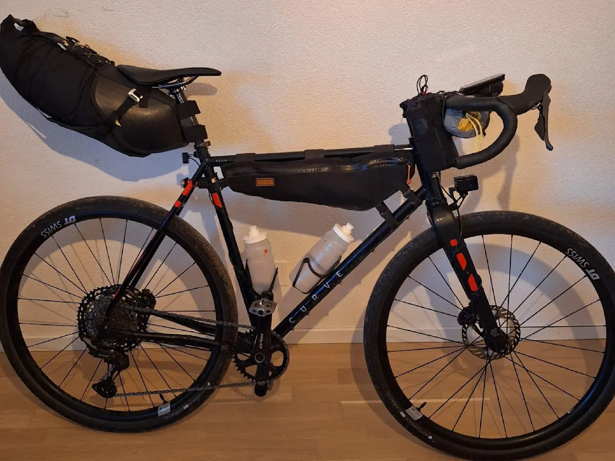 Bike: Curve Kevin of Steel with the 🥷🧜 color. Equipped with a shimano GRX 12*1. The front bracket is 38 to tackle the steepest climb. The wheels are the DT Swiss G1800 with dynamo hub. They are mounted with Hutchinson Caracal in 40. Front light is a Caminade Llum equipped with USB port to load my electronics. The rear light is a Super Nova E3. Finally, cherry on the cake the seatpost and the stem are Thomson.